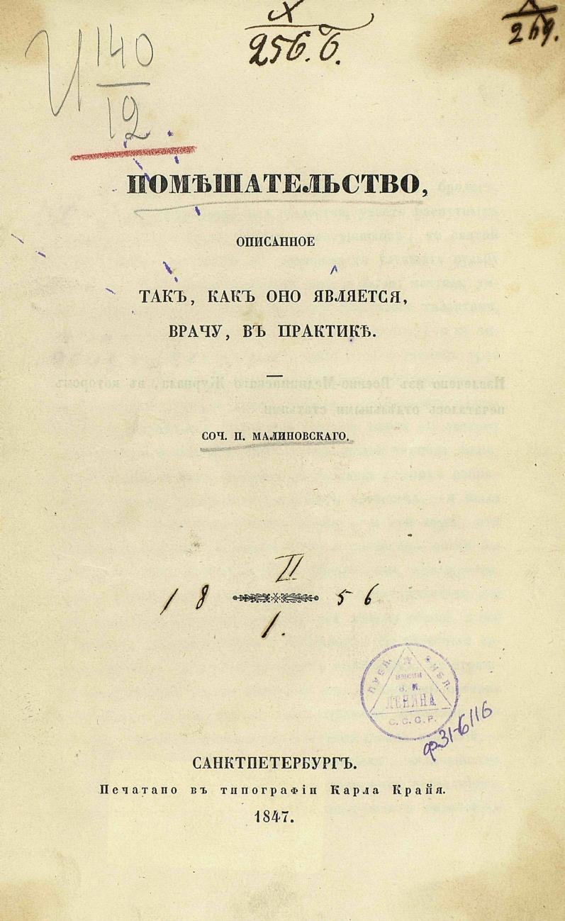 Малиновский, Павел Петрович (1818–). Помешательство, описанное так, как оно является врачу в практике / Соч. П. Малиновского. — Санкт-Петербург : тип. К. Крайя, 1847. — 324 с.; 23.