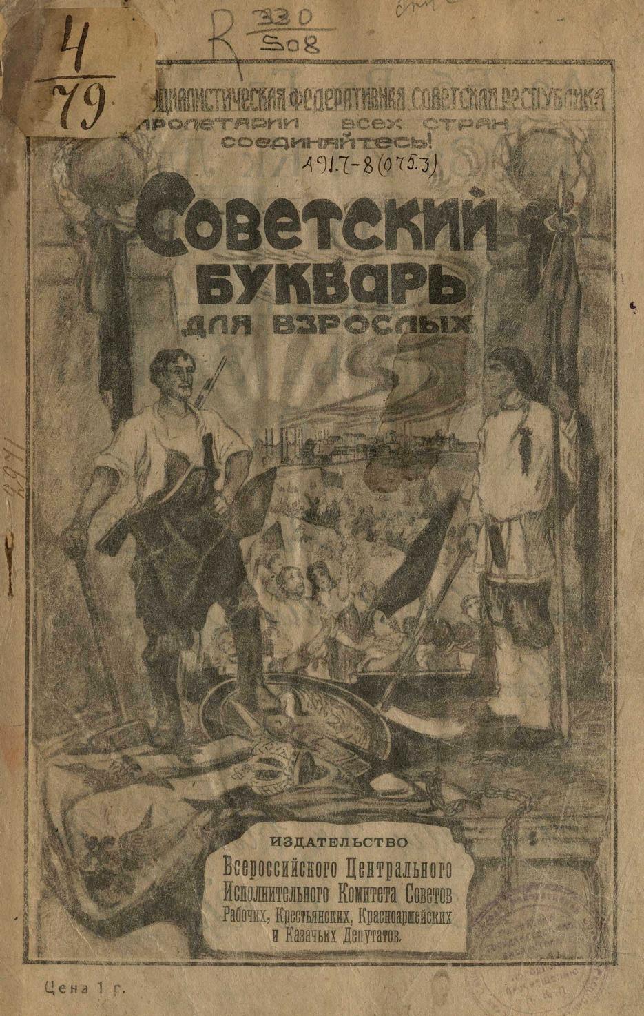 Советский букварь для взрослых. — Москва : Изд-во Всерос. центр. испол. ком. Сов. р. к., к. и к. д., [1918]. — 32 с. : ил.; 27 см.