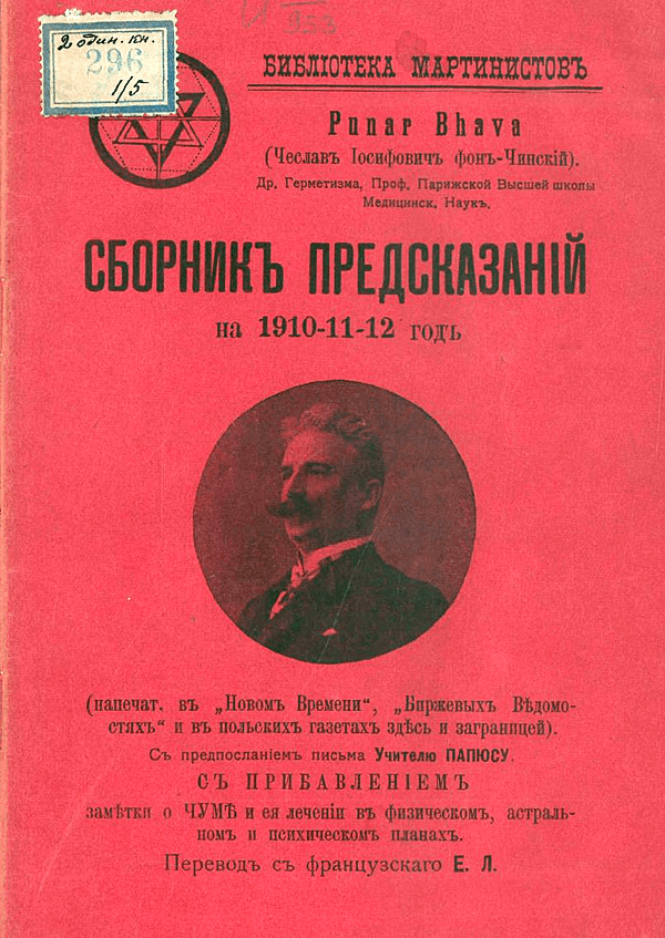 Собрание предсказаний на 1910-11-12 год (напечат. в «Новом времени», «Биржевых ведомостях» и в польских газетах здесь и за границей). С предпосланием письма учителю Папюсу. С приб. заметки о чуме и ее лечении в физическом, астральном и психическом плана
