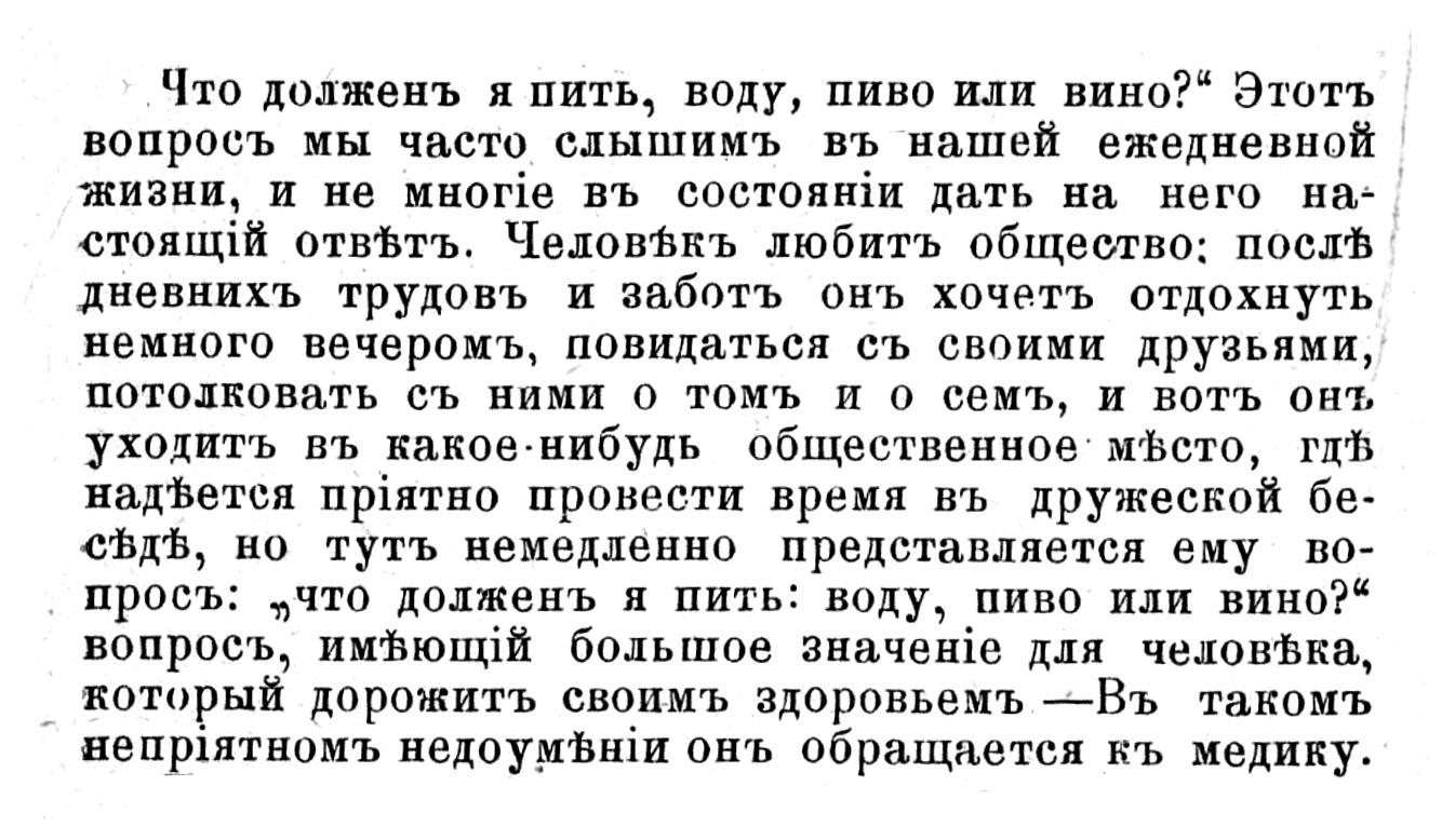Что долженъ я пить, воду, пиво или вино?“ Этотъ вопросъ мы часто слышимъ въ нашей ежедневной жизни, и не мног!е въ состоян1и дать на него на <стояций отвЪтъ. Человъкъ любитъ общество: посл® дневнихъ трудовъ и заботъ онъ хочетъ отдохнуть немного вечеромъ, повидаться съ своими друзьями, потолковать съ ними о томъЪ и 0 семъ, и вотъ онЪ уходитъ въ какое-нибудь общественное: мЪсто, гдЪ надъется пр1ятно провести время въ дружеской бесЪдЪ, но тутъ немедленно представляется ему вопросъ: „что долженъ я пить: воду, пиво или вино?“ вопросъ, имъющй большое значент1е для человФка, который дорожитъ своимъ здоровьемъ —Въ такомъ неприятномъ недоум®н!и онъ обращается къ медику.