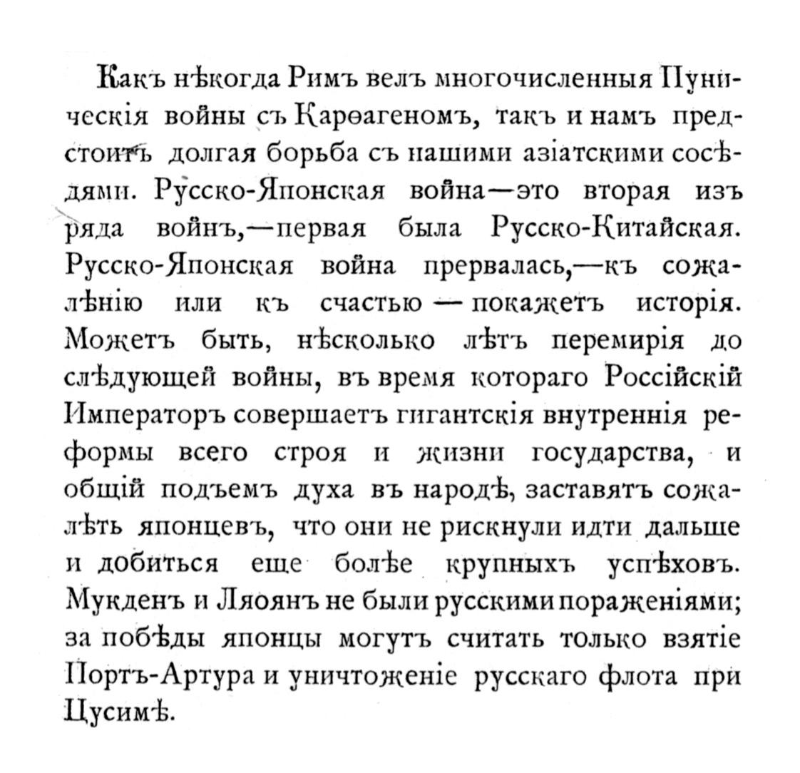 Какъ нЪкогда Римъ велъ многочисленныя Пуническ1я войны съ Кареагеномъ, такъ и намъ предстоитъ долгая борьба съ нашими азлатскими сосЪдямн. Русско-Японская война—это вторая изъ ряда войнъ,—-первая была Русско-Китайская. Русско-Японская война прервалась,—-къ сожалЪыю или окъ счастью — покажетъ история. Можетъ быть, нЪсколько лЪтъ перемиря до слЪдующей войны, въ время котораго Россйский Императоръ совершаетъ гигантския внутреншя реформы всего строя и жЖизни государства, и обиий подъемъ духа въ народЪ, заставять сожалЪть японцевъ, что они не рискнули идти дальше и добиться еще болЪе крупныхъ успЪховЪъ. Мукденъ и Ляоянъ не были русскими поражениями; за побФды японцы могутъ считать только взят!е Портъ-Артура и уничтоженте русскаго флота при Цусим.