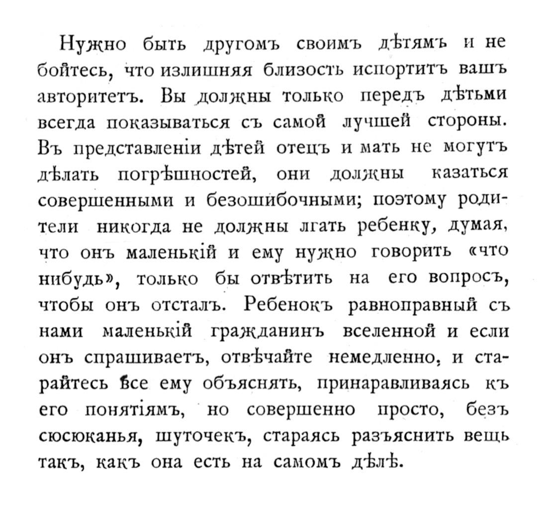 Нужно быть другомъ своимъ дЪтямъ и не бойтесь, что излишняя близость испортить вашЪъЪ авторитетъ. Вы должны только передъ дЪтьми всегда показываться съ самой лучшей стороны. Въ представлени дЪтей отецъ и мать не могутъ дЪлать погрЪшностей, они должны — казаться совершенными и безошибочными; поэтому родители никогда не должны лгать ребенку, думая, что онъ маленькйй и ему нужно говорить «что нибудь», только бы отвЪтить на его вопросъ, чтобы онъ отсталъ. Ребенокъ равноправный съ нами маленькй гражданинъ вселенной и если онъ спрашиваетъ, отвЪчайте немедленно, и старайтесь Все ему объяснять, принаравливаясь къ его понятямъ, но совершенно просто, безъ сюсюканья, шуточекъ, стараясь разъяснить вещь такъ, какъ она есть на самомъ дЪлЪ.