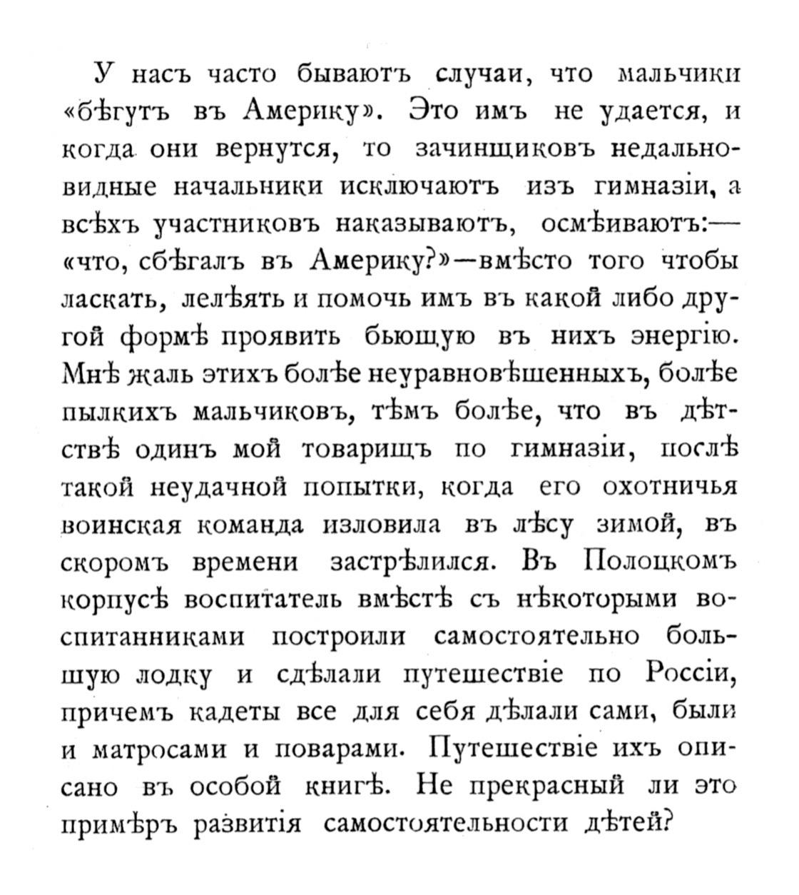 У насъ часто бываютъ случаи, что мальчики «бЪгутъ въ Америку». Это имъ не удается, и когда. они вернутся, то зачинщиковЪ недальновидные начальники исключаютъ изъ гимнази, а всЪхъ участниковъ наказываютъ, осмФиваютъ:—— «что, сбъгалъ въ Америку?»—вмЪсто того чтобы ласкать, лелЪять и помочь имъЪ въ какой либо другой формЪ проявить бьющую въ нихъ энергию. МнЪ жаль этихъ болЪе неуравновЪшенныхъ, болЪе пылкихъ мальчиковъ, тЪмъ болЪе, что въ дЪтствЪ одинъ мой товарищъ по гимназши, послЪ такой неудачной попытки, когда его охотничья воинская команда изловила въ лЪсу зимой, въ скоромъ времени застрФлился. Въ Полоцкомъ корпусЪ воспитатель вмЪст® съ нЪкоторыми воспитанниками построили самостоятельно большую лодку и сдФЪлали путешестве по Росси, причемъ кадеты все для себя дЪлали сами, были и матросами и поварами. Путешествие ихъ описано въ особой книг®. Не прекрасный ли это примЪръ развитя самостоятельности дЪтей?