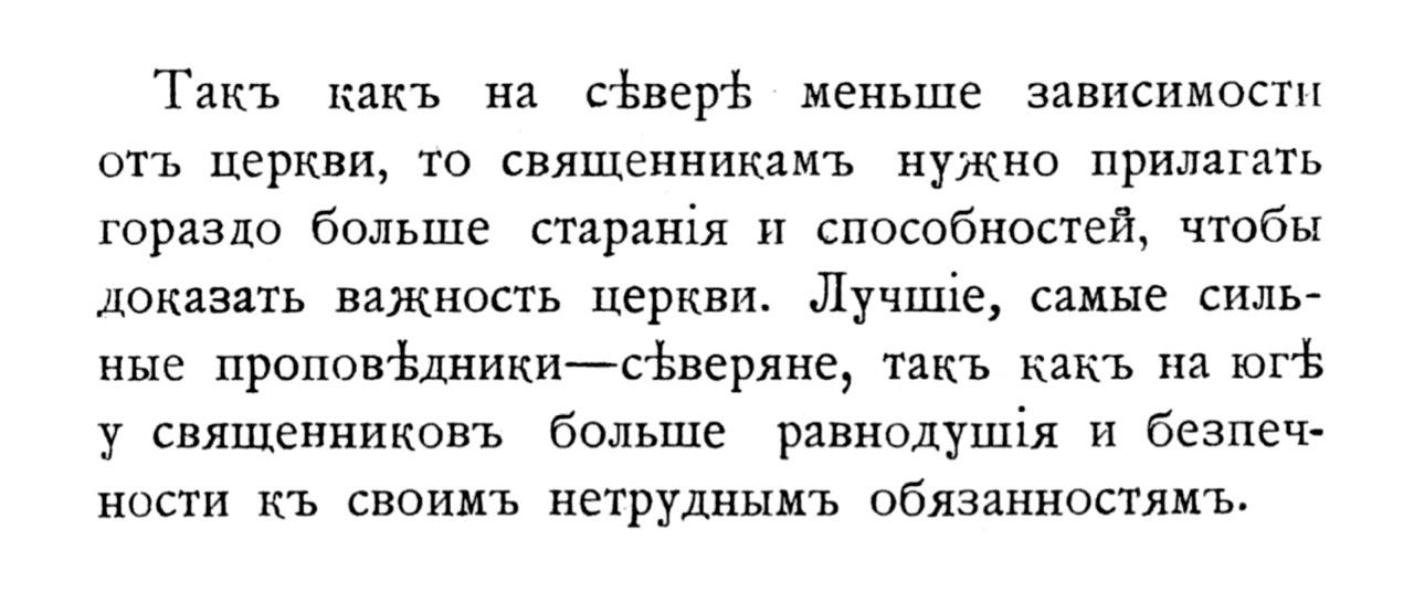 Такъ какъ на сФверЪ меньше зависимости отъ церкви, то священникамъ нужно прилагать гораздо больше старашя и способностей, чтобы доказать важность церкви. Лучшие, самые сильные проповЪдники— сЪверяне, такъ какъ на юг® у священниковъ больше равнодушия и безпечности къ своимъ нетруднымъ обязанностямЪ.