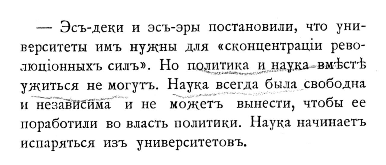 — Эсъ-деки и эсъ-эры постановили, что университеты имъ нужны для «сконцентраши револющонныхъ силъ». Но политика и наука-вмЪстЪ ужиться не могуть. Наука всегда была свободна и независйма и не можетъ вынести, чтобы ее поработили во власть политики. Наука начинаетъ испаряться изъ университетовЪ.