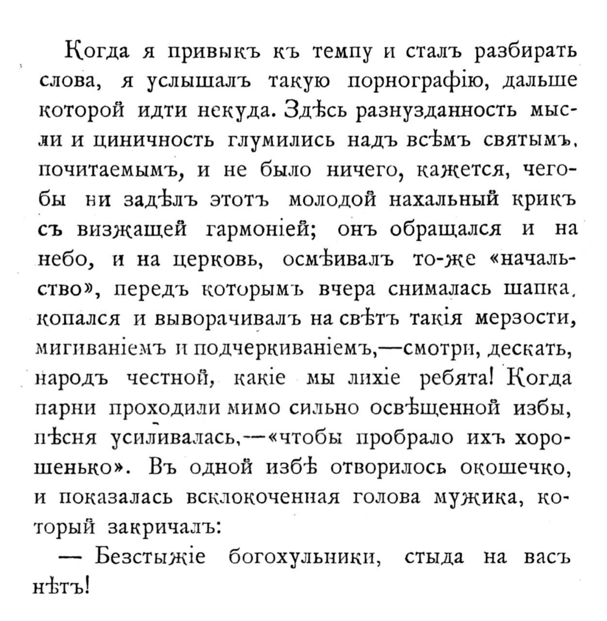 Когда я привыкъ къ темпу и сталъ разбирать слова, я услышалъ такую порнографию, дальше которой идти некуда. ЗдЪсь разнузданность мысли и циничность глумились надъ всЪмЪ святЫМЪ, почитаемымъ, и не было ничего, кажется, чегобы ви задЪлъ этотъ молодой нахальный крикЪ съ визжащей гармонтей; онъ обращался и на небо, и на церковь, осмФивалъ то-же «начальство», передъ которымъ вчера снималась шапка, копался и выворачивалъ на свЪтъ так1я мерзости, мигивашемъ и подчеркиванемъ,——смотри, дескать, народъ честной, каке мы лих1е ребята! Когда парни проходили мимо сильно освЪщенной избы, пЪсня усиливалась,-——«чтобы пробрало ихъ хорошенько». Въ одной избЪ отворилось окошечко, и показалась всклокоченная голова мужика, который закричалъ: