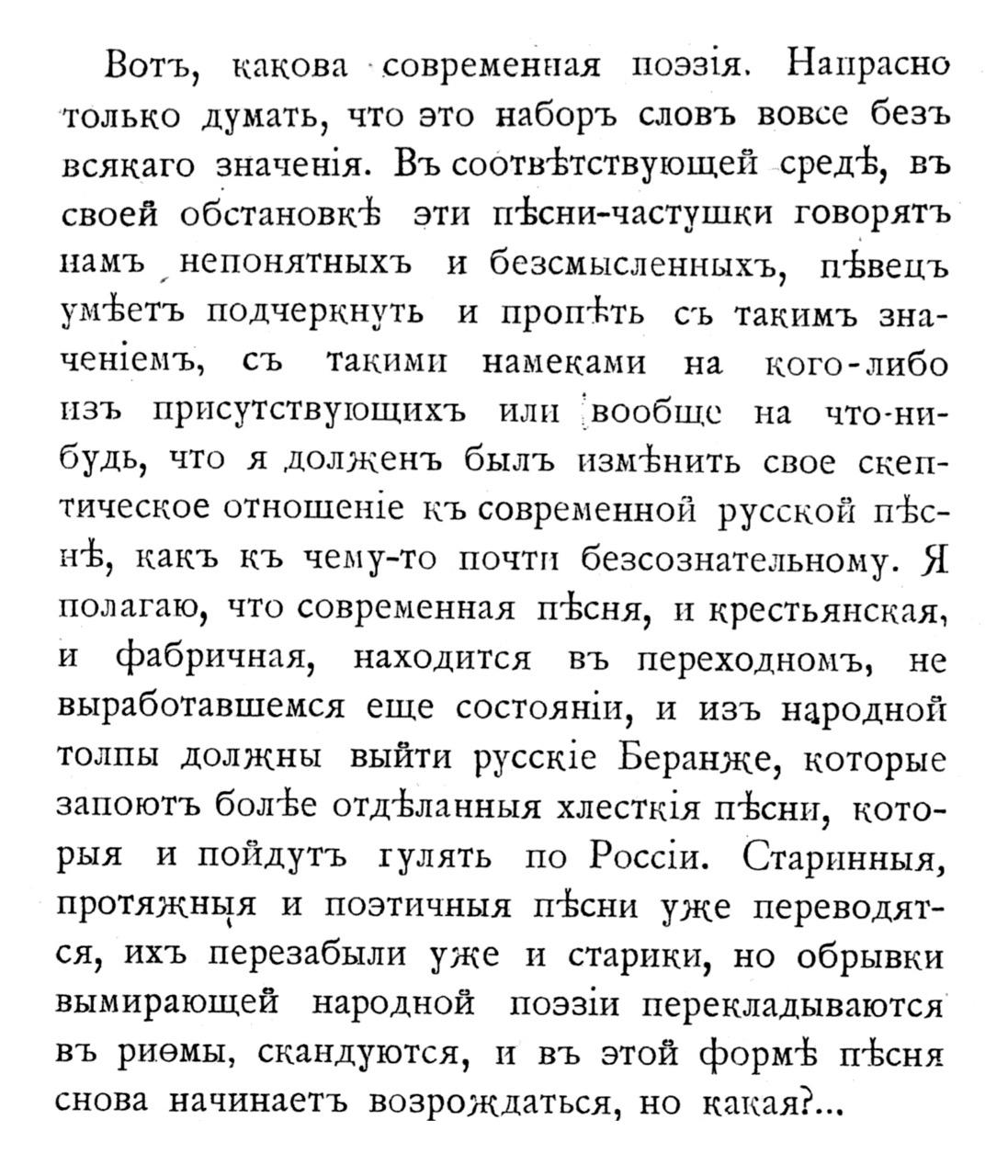 Вотъ, какова - современная поэзия. Напрасно только думать, что это наборъ словъ вовсе безъ всякаго значешя. Въ соотвЪтствующей средЪ, въ своей обстановкЪ эти шФсни-частушки говорятъ намъ непонятныхъ и безсмысленныхъ, пЪвецъ умФетъ подчеркнуть и пропЖть съ такимъЪ значен1емъ, съ такими намеками на кого-либо изъ присутствующихъ или ‘вообще на что-нибудь, что я долженъ былъ измФнить свое скептическое отношенте къ современной русской пЪснФ, какъ къ чему-то почтп безсознательному. Я полагаю, что современная пЪсня, и крестьянская, и фабричная, находится въ переходномъ, не выработавшемся еще состоянии, и изъ народной толпы должны выйти русские Беранже, которые запоютъ болЪе отдЪланныя хлестк1я пФсни, которыя и пойдутъ гулять по России. Старинныя, протяжныя и поэтичныя пЪсни уже переводятся, ихъ перезабыли уже и старики, но обрывки вымирающей народной поэзш перекладываются въ риемы, скандуются, и въ этой формЪ пЪсня снова начинаетъ возрождаться, но какаля!?...