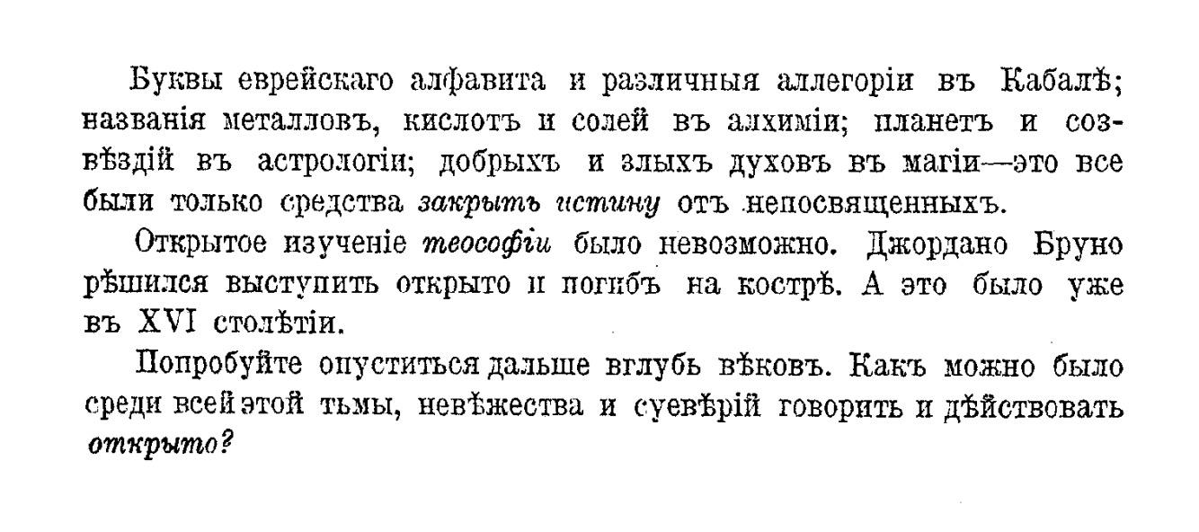 Открытое изучен!е теософзи было невозможно. Джордано Бруно рЫшился выступить открыто и погибъ на костр®. А это было уже въ ХУГ стол®ти.