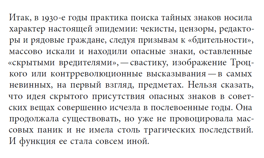 Итак, в 1930-е годы практика поиска тайных знаков носила характер настоящей эпидемии: чекисты, цензоры, редакторы и рядовые граждане, следуя призывам к «бдительности», массово искали и находили опасные знаки, оставленные «скрытыми вредителями», — свастику, изображение Троцкого или контрреволюционные высказывания — в самых невинных, на первый взгляд, предметах. Нельзя сказать, что идея скрытого присутствия опасных знаков в советских вещах совершенно исчезла в послевоенные годы. Она продолжала существовать, но уже не провоцировала массовых паник и не имела столь трагических последствий. И функция ее стала совсем иной.