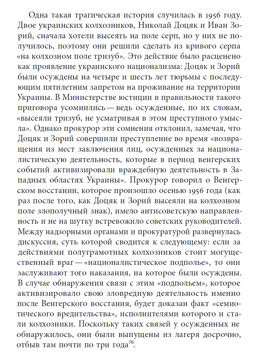 Одна такая трагическая история случилась в 1956 году. Двое украинских колхозников, Николай Доцяк и Иван Зорий, сначала хотели высеять на поле серп, но у них не получилось, поэтому они решили сделать из кривого серпа «на колхозном поле тризуб». Это действие было расценено как проявление украинского национализма: Доцяк и Зорий были осуждены на четыре и шесть лет тюрьмы с последующим пятилетним запретом на проживание на территории Украины. В Министерстве юстиции в правильности такого приговора усомнились — ведь осужденные, по их словам, «высеяли тризуб, не усматривая в этом преступного умысла». Однако прокурор эти сомнения отклонил, замечая, что Доцяк и Зорий совершили преступление во время «возвращения из мест заключения лиц, осужденных за националистическую деятельность, которые в период венгерских событий активизировали враждебную деятельность в Западных областях Украины». Прокурор говорил о Венгерском восстании, которое произошло осенью 1956 года (как раз после того, как Доцяк и Зорий высеяли на колхозном поле злополучный знак), имело антисоветскую направленность и не на шутку встревожило советских руководителей. Между надзорными органами и прокуратурой развернулась дискуссия, суть которой сводится к следующему: если за действиями полуграмотных колхозников стоит могущественный враг— «националистическое подполье», то они заслуживают того наказания, на которое были осуждены. В случае обнаружения связи с этим «подпольем», которое активизировало свою зловредную деятельность именно после Венгерского восстания, будет доказан факт «семиотического вредительства», исполнителями которого и стали колхозники. Поскольку таких связей у осужденных не обнаружилось, они были выпущены из лагеря досрочно, отбыв там почти по три года”.