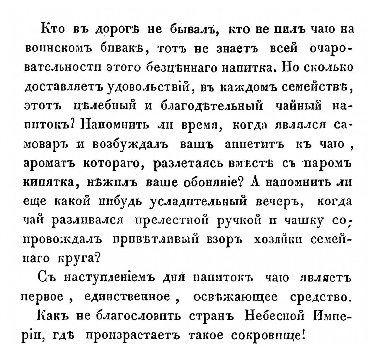 Кто въ дорогь не бывалъ, кто не пилъ чаго на вопнскомъ бпвакъ, тотъ не знаетъ всей очаровательностп этого безцъннаго напитка. Но сколько доставляетъ удовольстви!, въ каждомъЪ семействЪ, этотъ цЪлебный и благодътельный чайный напитокъ? Напомнить ли время, когда явлался самоваръ и возбуждалъ вашъЪ аппетитъ къЪ чаю , ароматъ котораго, разлетаясь вместь съ паромъ кипатка, нъжилъ ваше обоняне? А напомнить ли еще какой нпбудь усладительный вечеръ, когда чай разливался прелестной ручкой п чашку со; провождалъ привътливый взоръ хозяйки семейнаго круга?