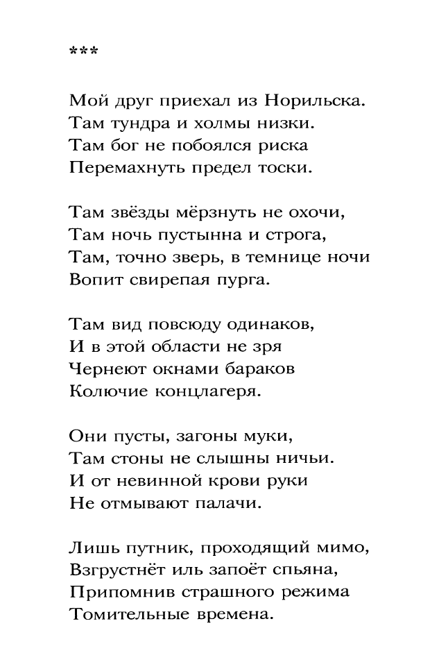 Там вид повсюду одинаков, И в этой области не зря Чернеют окнами бараков Колючие концлагеря.