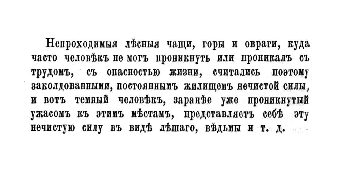 Непроходимыя л®еныя чащи, горы и овратги, вуда часто челов®кЪ не могъ проникнуть или проникалъ 6Ъ трудомъ, съ опасностью жизни, считались — поэтому заколдованными, постояннымъЪ жилищемъ нечистой силы, и вотъ темный челов®къ, Заран®е уже проникнутый ужасомъ кЪ этимЪ мФстамъ, представляеть себ% эту нечистую силу въ вид® л®шаго, в®дьмы и т. Д.