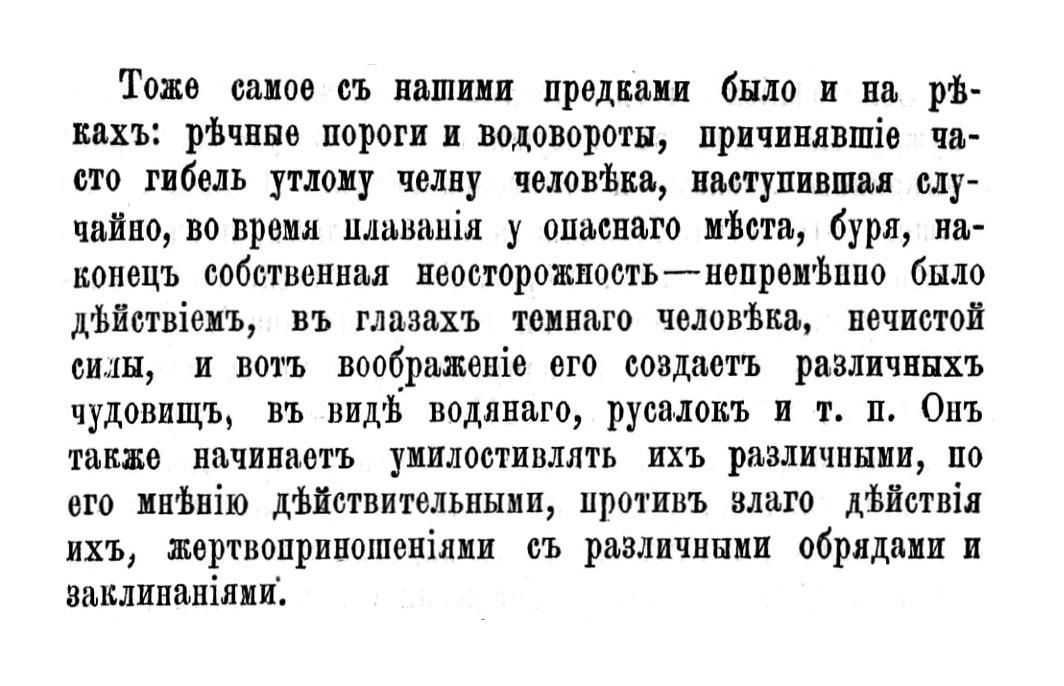 Тоже самое съ нашими предками было и на р%кахъ;: р®чные пороги и водовороты, причинявше часто гибель утлому челну человфка, наступившая случайно, во время плавашя у опаенаго мста, буря, наконецъ собственная неосторожность— непрем\ино было дЪйств1емъ, вЪ глазахъ темнаго человФка, нечистой вилы, и вотъ воображенте его создаетъ различныхЪ чудовищъ, ВЪ вид® водянаго, русалокъ и т. п. Онъ также начинаеть умилостивлять ихъ различными, по его мнФн1ю дФйствительными, противъ влаго д®йств1я ихъ, Жертвоприношен1ями съ различными обрядами и заклинанями,