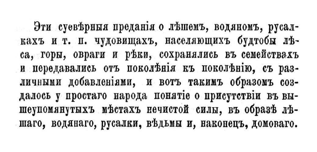 Эти суев®рныя предашя о лЪшемъ, водяномъ, русалкахъ и т. п. чудовищахъ, населяющихъ будтобы л®ва, торы, овраги и р%ки, сохранялись вЪ семействахъ и передавались отъ поколФш1Я КЪ ПОКолФн1Ю, сЪ различными добавлемями, и вотъ такимъ образомъ создалобь у простато народа понят!е о присутствИи ВЪ ВЫшеупомянутыхЪ ифстахъ нечистой сиды, въ образ® д®шаго, водянаго, русалки, в®дьмы и, наконедъ, домовато.