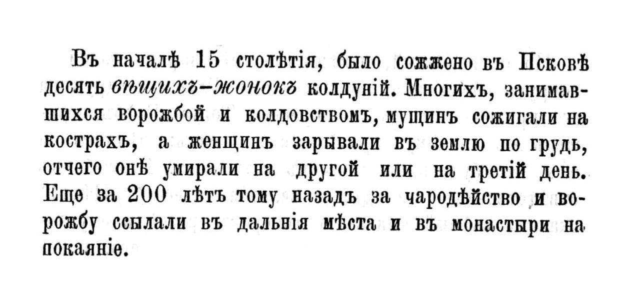Въ началЪ 15 стол®тя, было сожжено въ Псков® десять бъщило-жоноко колдунй. Многихъ, занимавшихся ворожбой и колдовствомЪ, мущинъ сожигали на кострахъ, а женщинъ зарывали въ землю по грудь, отчего он® умирали на другой или на третй день. Еще за 200 л%тъ тому назадъ за чарод®Иство и ворожбу ссылали въ дальш1я мФста и въ Монастыри на покаянте.