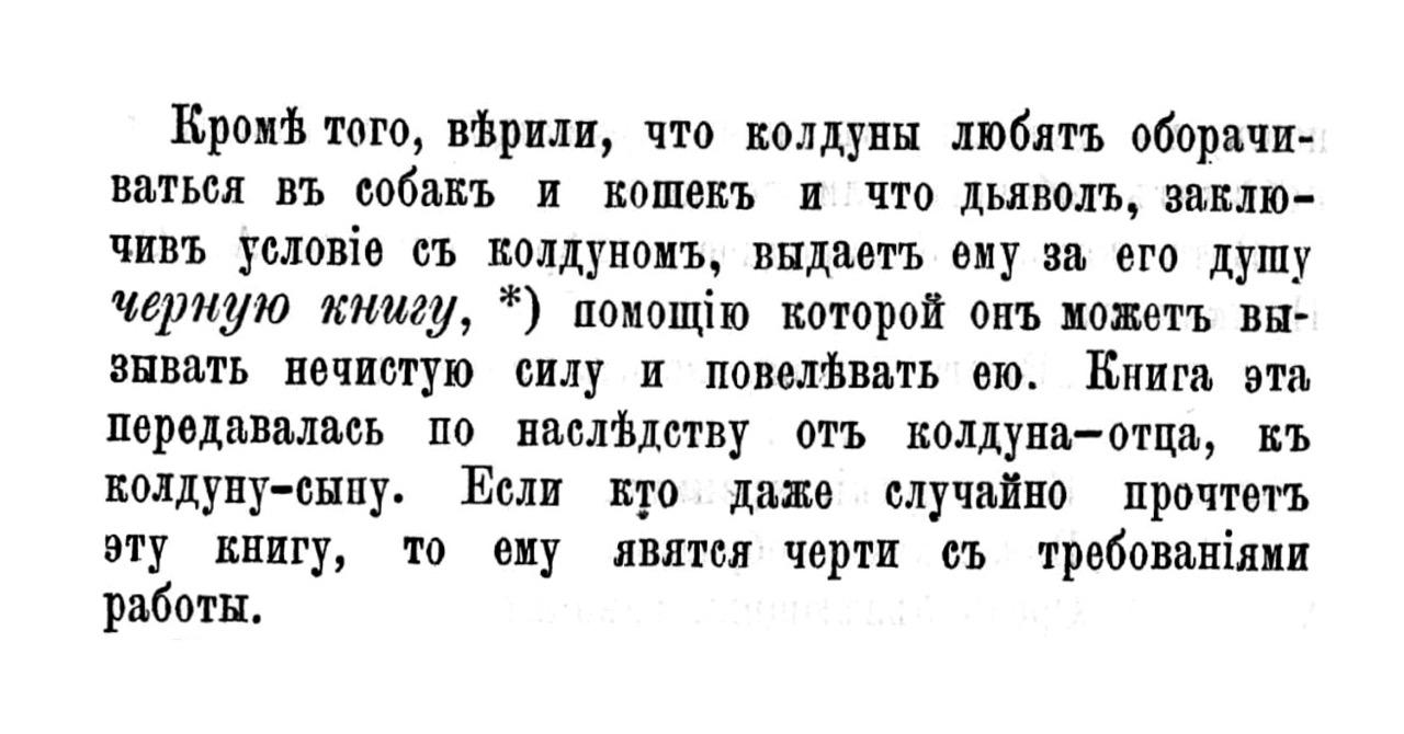 Кром% того, вврили, что колдуны любятъ оборачиваться въ собакъ и кошекъ и что дьяволъ, заключивъ услов1е съ колдуномъ, выдаетъ ему за его душу черную книгу, *) помощ!ю которой онъ можетъ ВЫзывать нечистую силу и повелфвать ею. Книга эта передавалась по насл®дству отъ колдуна-отца, кЪ колдуну-сыну. Кели вто даже случайно прочтетъ Эту книгу, "То ему явятся черти съ требован!ями работы.