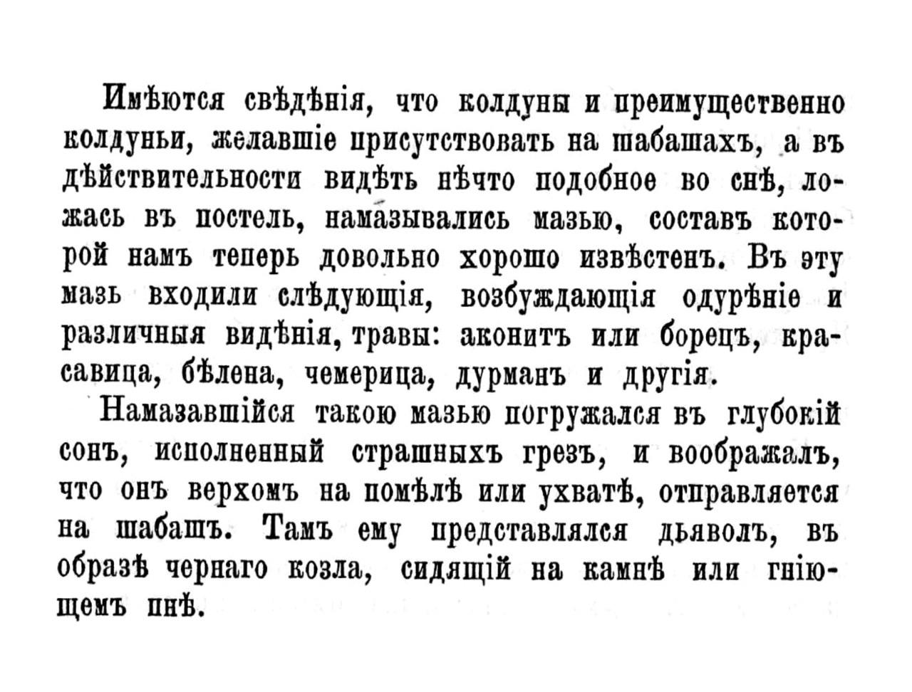 Ин®ются свды!я, что колдуны и преимущественно колдуньи, желавш!е присутствовать на шабашахъЪ, & вЪ дВйствительности ВИдФть нФчто подобное во ен®, ложась вЪ постель, намазывались мазью, составъ которой намъ теперь довольно хорошо изв®стенъ, Въ эту мазь входили сл$дующия, возбуждающия одур®н!е и различныя видФн!я, травы: аконитъ или борецъ, красавица, б*лена, чемерица, дурманъ и другя.