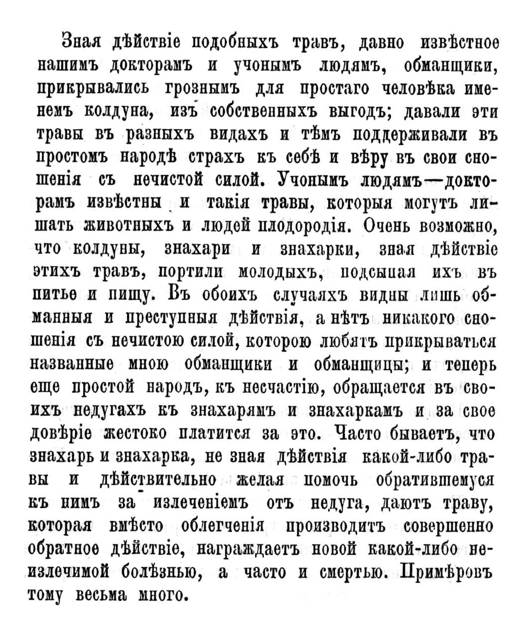 Зная д®йств1е подобныхъ травъ, давно извфстное нашимъ докторамъ и учонымъ людямъ, обманщики, прикрывались грознымъ для простаго человФка именемъ колдуна, изъ собственныхЪ ВЫГодЪ; давали эти травы въ разныхъ видахъ и тФмъ поддерживали въЪ простомъ народ® страхъ кЪ себ% и в®ру въ свои сношеня съ нечистой силой. Учонынъ людямЪ—довторамъ извФетны и тав1я травы, которыя могутъ лиШшать ЖивотныхЪ и людей плодород1я. Очень возможно, что колдувы, знахари и знахарки, звнал д®йств!е этихъ травъ, портили молодыхъ, подсыпал ихъ ВЪ питье и пищу. Въ обоихъ случаяхъ видны лишь 09манныя и преступныя дЪИств1я, & Н®тЪ нИкакого сношешя съ нечистою силой, которою любятъ прикрываться названные мною обманщики и обманщицы; и теперь еще простой народъ, къ несчасттю, обращается въЪ своихъ недугахъ къ знахарямъ и знахаркамъ и за свое дов®р!е жестоко платитея ва это. Часто бываетъ, что знахарь и знахарка, не зная д®Иств1я какой-либо травы и д*йствительно - желая — помочь обратившемуся кЪъ НИМЪ за излечен!емъ отЪ недуга, даютъ траву, которая вмФето облегченя — производитъ совершенно обратное д®йств1е, награждаетъь новой какой-либо неизлечимой болФзнью, а& часто и смертью. Примбровъ тому весьма много.