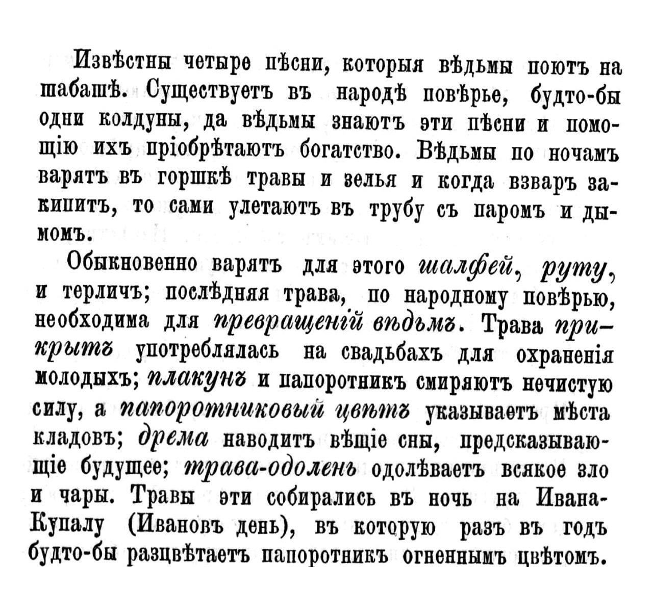 Обыкновенно варять для этого шалфей, руту, и терличъ; посл$дняя трава, по народному повФрью, необходима для превращенсей въдьмг. Трава прикрытё употреблялась на свадьбахъ для охранен!я холодыхъ; пЛакунё и папоротникъ смиряютъ нечистую силу, а папоротниковый цвътё указываетъ м%ста кладовъ; Орема наводить в%щ1е сны, предскавывающ!е будущее; трава-одолень одолъваеть всякое 8ло и чары. Травы эти собирались вЪ ночь на ИванаКупалу (Ивановъ день), въ которую разъ въ ТодъЪ будто-бы разцвЪтаеть папоротникЪ огненнымъ цвфтомъ.