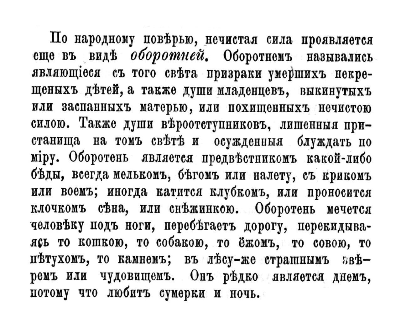 По народному пов%рью, нечистал сила проявляется еще въ вид® оборотней. Оборотнемъ назывались являющ!еся съ того свФта призраки умершихЪ некрещеныхъЪ д®тей, а также души младенцевъ, ВЫкинутыхЪ или заспанныхЪ матерью, или похищенныхЪ нечистою силою. Также души в®роотетупниковъ, лишенныя пристанища на томЪ св®т® и осужденныя блуждать по м1ру. Оборотень является предвфстникомъ какой-либо б%ды, всегда мелькомъ, бъгомъ или налету, ©Ъ крикомъ или воемъ; иногда катится клубкомъ, или проносится клочкомъ с®на, или снФжинкою. Оборотень мечется челов®ку подъ ноги, перебтаетъ дорогу, перекидываябь то кошкою, то 6обакою, то ёжомъ, то совою, то иЪтухомъ, то камнемъ; вЪ л®су-же страшнымЪ 5в%ремъ или чудовищемъ. Онъ рВдко является днемъЪ, потому что любитъ сумерки и ночь.