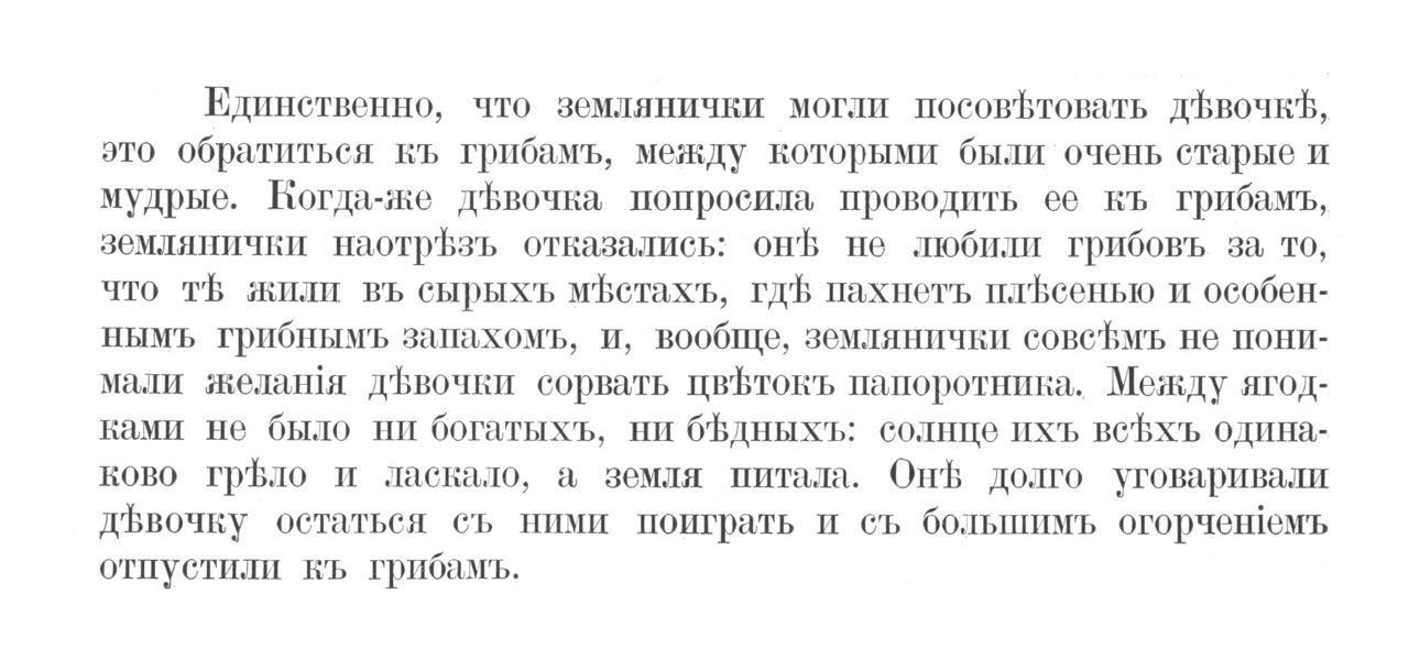 Единственно, что землянички могли посовЪтовать дЪвочкЪ, это обратитьея къ грибамъ, между которыми были очень старые и мудрые. Богда-же дЪвочка попросила проводить ее къ грибамъ, землянички наотрбзъ отказались: онЪ не любили грибовъ за то, что тБ жили въ сырыхъ мФетахъ, гдЪ пахнетъ плЪсеенью и особеннымъ грибнымъ запахомъ, и, вообще, землянички совеБмъ не понимади желаня дЪвочки сорвать цвЪтокъ папоротника. Между ягодками не было ни богатыхъЪ, ни Оъдныхъ: солнце ихъ веЪхъ одинаково грёло и ласкало, а вемля питала. ОнФЪ долго уговаривали дЪвочку остаться съ ними поиграть и съ большимъ огорчен1емъ отпустили къ грибамъ.