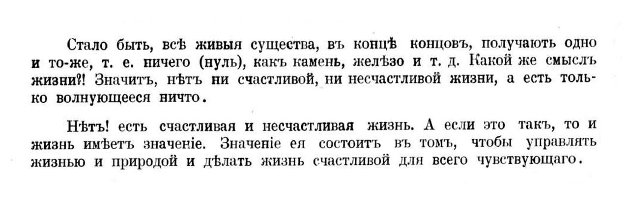 Нетъ! есть счастливая и несчастливая жизнь. А если это такъ, то и жизнь имеетъ значение. Значение ее состоить въ томъ, чтобы управлять жизнью и природой и делать жизнь счастливой для всего чувствующаго.