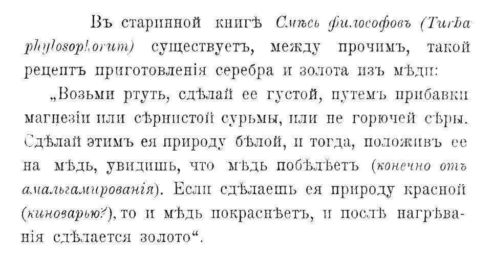 Въ старинной книгЪ Смъсь философовъ ( ТигЬа рИиу'овор! огит)  существуетъ, между прочимъ, такой рецептъ приготовлен!я серебра и золота, изъ мЪди: