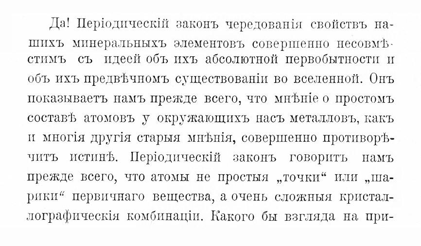 Да! Перюдическйй законъ чередования свойствъ нашихъ минеральныхЪ элементовъ совершенно несовмЪ стимъ съ идеей объ ихъ абсолютной первобытности и объ ихъ предвЪчномъ существовашши во вселенной. Онъ показываетъ намъ прежде всего, что мнЪше о простомъ составЪ атомовъ у окружающихъ насъ металловъ, какъ и мноп\я друм\я старыя миЪшя, совершенно противорЪчитъь истинЪ. Перюдическйй законъ говорить намъ прежде всего, что атомы не простыя „точки“ или „Шарики“ первичнаго вещества, а очень сложныя кристаллографическ!я комбинаци. Какого бы взгляда на при