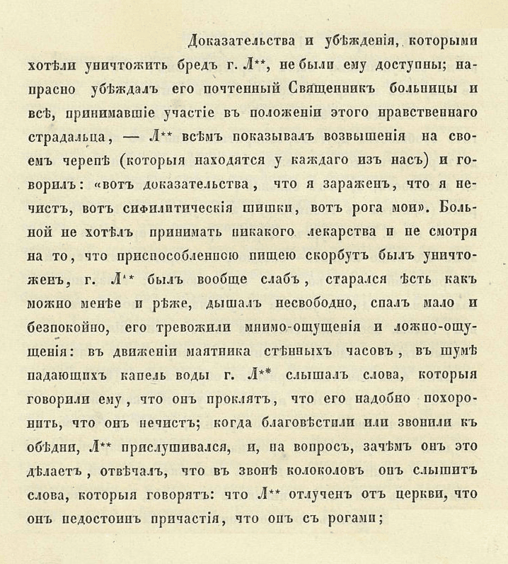 Доказательства и убъжден!я, ‚ которыми хотвли уничтожить бредъ г. Л**, не были ему доступны; напрасно убЪждалъ его почтенный Священникъ больпицы и всъ, принимавшие участ!е въ положении этого нравственнаго страдальца, — ** всвыъ показывалъ возвышен!я на своемъ черепъ (которыл находатся у каждаго изъ насъ) и говорилъ: «вотъ доказательства, что я зараженъ, что я нечистъ, вотъ сиФилитическ!я шишки, вотъ рога мон». Больной не хот$лъ принимать пикакого лекарства п нё смотря на то, что приспособлениою пищею скорбутъь былъ уничтоженъ, г. Л'* былъ вообще слабъ, старался Фсеть какъ можно менфе п рЪже, дышалъ несвободно, спалъ мало и безпокойно, его тревожили мнимо-ощущен!я и ложно-ощущеня: въ движен!и маятника стФнныхЪ часовъ, въ шум® падающихъ капель воды г. ** слышалъ слова, которыя товорили ему, что опъ проклятъь, что его надобно . похоронить, что онъ печистъ; когда благовбстили или звонили къ объдни, Д** приелушивался, и, на вопросъ, зачъмъ онъ это двлаетъ , отвЪчалъ, что въ звонФ® колоколовъ опъ слышИтЪ слова, которыя говорятъ: что Д** отлученъ отъ церкви, что