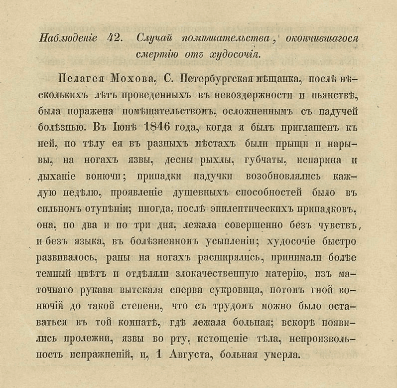 Пелагея' Мохова, С. Петербургская жыщанка, послЪ нЪсколькихъ лЪтъ проведенныхъ въ невоздержности и пьянствЪ, была поражена пом'ышательствомъ, осложненнымъ съ падучей болвзнью. Въ Тон® 1846 года, когда я былъ приглашенъ къ пеіі‚ по тБлу ея въ разныхъ мъстахъ были прыщи и нарывы, на ногахъ язвы, десны рыхлы, губчаты, испарина п дыхан!1е вонючи; припадки падучки возобновлялись каждую недълю, проявлене душевныхъ способностей было въ сильномъ отупЪн!и; иногда, посл® эпилептическихъ припадковЪ, она, по два и по’ три дня; лежала: совершенно безъ чувствъ
