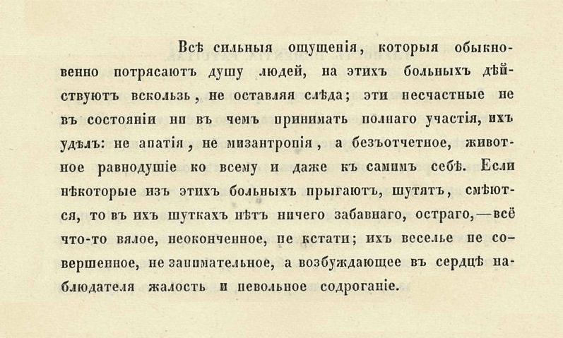 Вев сильныя ощущешя, которыя обыкновенно потрясаютъ душу людей, на этихъ больныхъ дЪйствуютъ вскользь , не оставляя слФда; эти несчастные не въ состоян!и нп въ чемъ принимать полпаго участ!я, ихъ удълъ: не апат!я , не мизантрошя , а безъотчетное, животное равнодуше ко всему и даже къ сампмъ себъ. Если нфкоторые изъ этихъ больныхъ прыгаютъ, шутятъ, смЪются, то въ ихъ шуткахъ нфтъ ничего забавнаго, остраго, — веё что-то вялое, неоконченное, пе кстати; ихъ веселье пе совершенное, не заппмательное, а возбуждающее въ сердц® наблюдателя жалость и певольное содрогане.