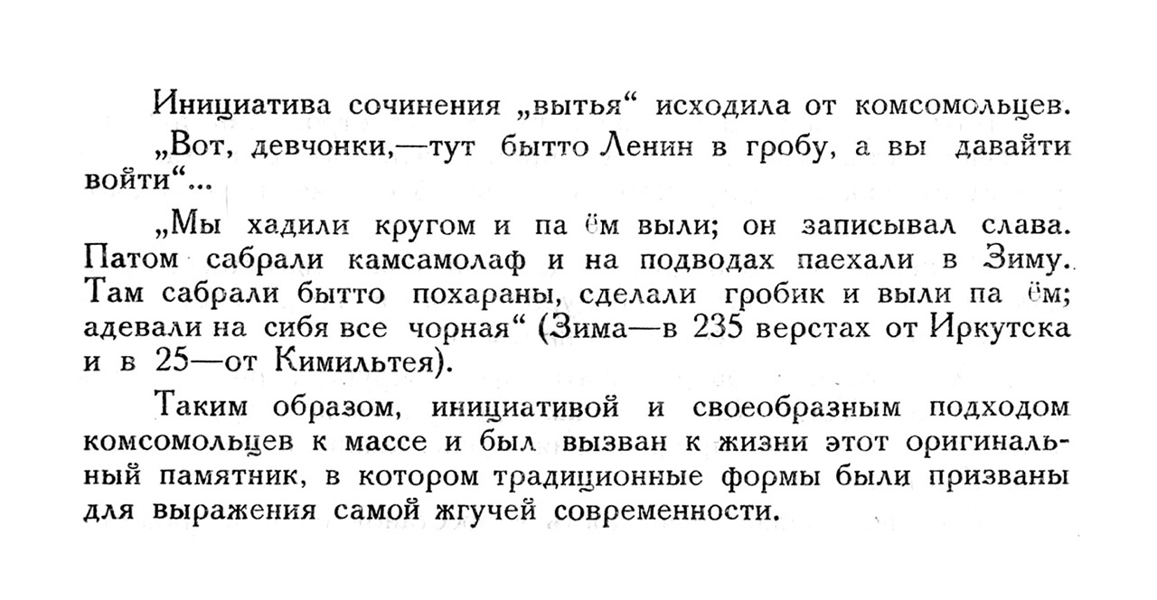 „Мы хадили кругом и па м выли; он записывал слава. Патом: сабрали камсамолаф и на подводах паехали в Зиму. Там сабрали бытто похараны, сделали гробик и выли па м; адевали на сибя все чорная“ (Зима— в 235 верстах от Иркутска и в 25— от Кимильтея).