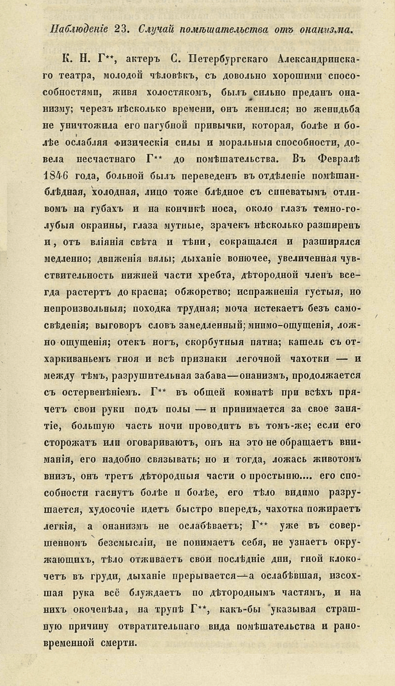 К. Н. Г**, актеръ С. Петербургскаго Александринскаго театра, молодой чфловЪкъ, съ довольно хорошими`спосособностями, живя холостякомъ, былъ сильно преданъ онанизму; черезъ нвсколько времени, онъ женился; но женидьба не уничтожила его пагубной привычки, которая, болъе и болфе ослабляя физическия силы и моральныя способности, довела несчастнаго Г** до помФшательства. Въ Февралъ 1846 года, больной былъ переведенъ въ отдЪлен!е помъшанбл$дная, холодная, лицо тоже блъдное съ сппеватымъ отливомъ на губахъ и на кончикФ носа, около глазъ темно-голубыя окраины, глаза мутные, зрачекъ нвсколько разширенъ и, отъ вляЫ!я свЬта и тФни, сокращался и разширялся медленно; движен!я вялы; дыхан!е вонючее, увеличенная чувствительность нижней части хребта, дЪтородной членЪ всетда растертъ до красна; обжорство; испражнен!я густыя, но непроизвольныя; походка трудная; моча истекаетъ безъ самосвЪден!я; выговоръ словъ замедленный; мнимо-ощущен!я, ложно-ощущен!я; отекъ ногъ, скорбутныя пятна; кашель съ отхаркиваньемъ гноя и всФ признаки легочной чахотки — и между тиъ, разрушительная забава—— онанизмъ, продолжается съ остервенъи!емъ. Г** въ общей комнат® при вехъ прячетъ свой руки подъ полы — и принимается за свое занят!е, большую часть ночи проводитъь въ томъ-же; если его сторожатъ или оговариваютъ, онъ на это не обращаетъ вниман!я, его надобно связывать; но и тогда, ложась животомъ