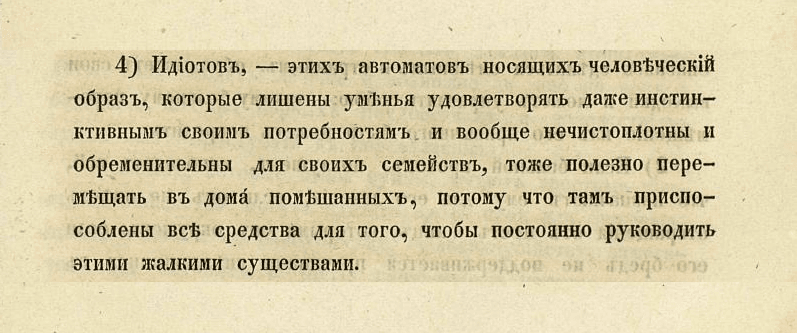 4) Идотовъ, — этихъ ‚автоматовъ! носящихъ человъческий образъ, которые! лишены ‘умънья удовлетворять „даже инстин—ктивнымъ своимъ потребностямъ. и вообще нечистоплотны и обременительны для своихъ семействъ, тоже полезно перемъщать въ дома помъшанныхЪ, потому что тамъ : приспособлены всъ средства для того, чтобы постоянно руководить этими жалкими существами: