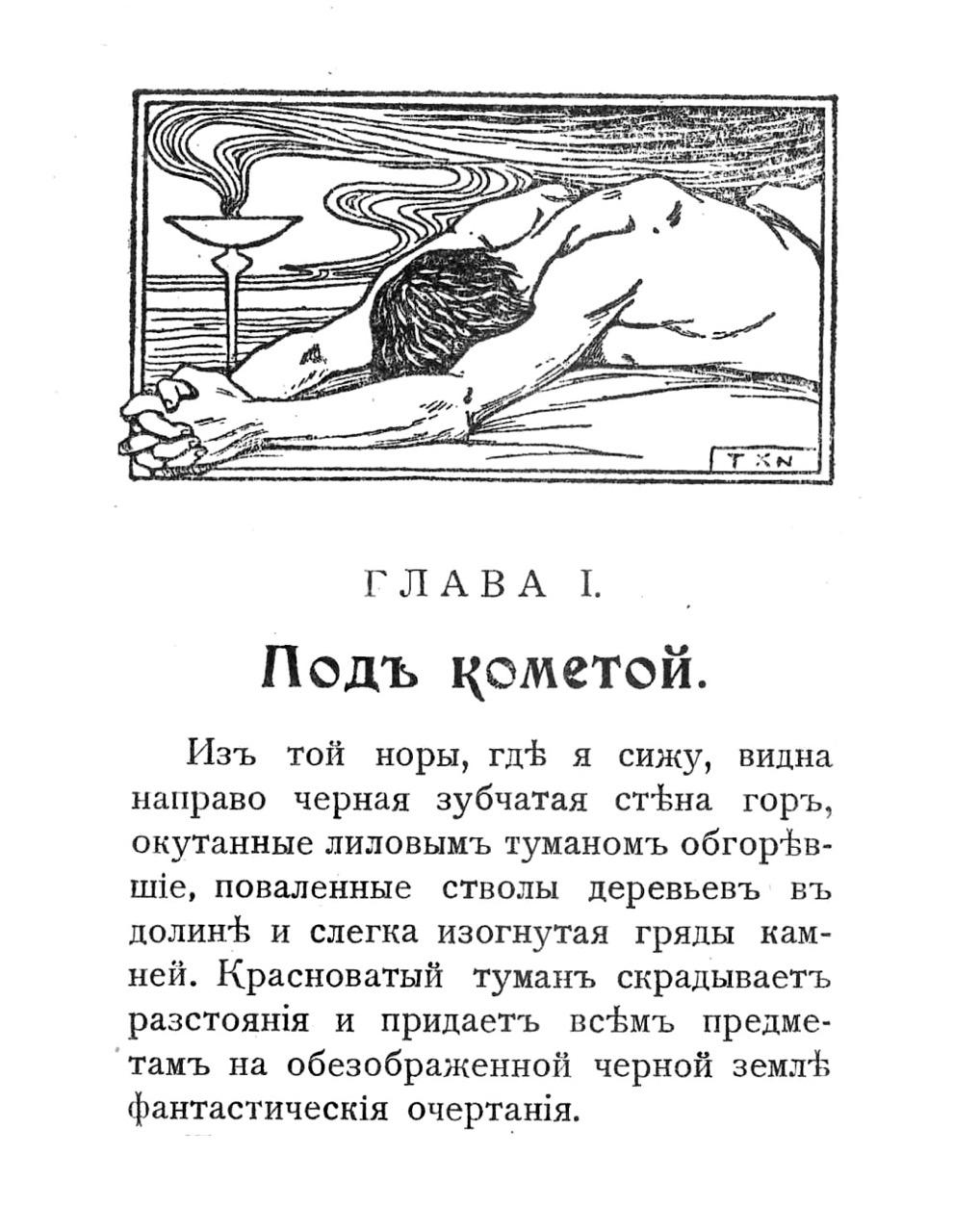 Изъ той норы, гдЪ я сижу, видна направо черная зубчатая стЪна горъ, окутанные лиловымъ туманомъ обгорвшйе, поваленные стволы деревьевъ вЪ долинЪ и слегка изогнутая гряды камней. Красноватый туманъ скрадываетъ разстояня и придаетъ всЪмъ предме`тамъ на обезображенной черной землЪ фантастическия очертания.