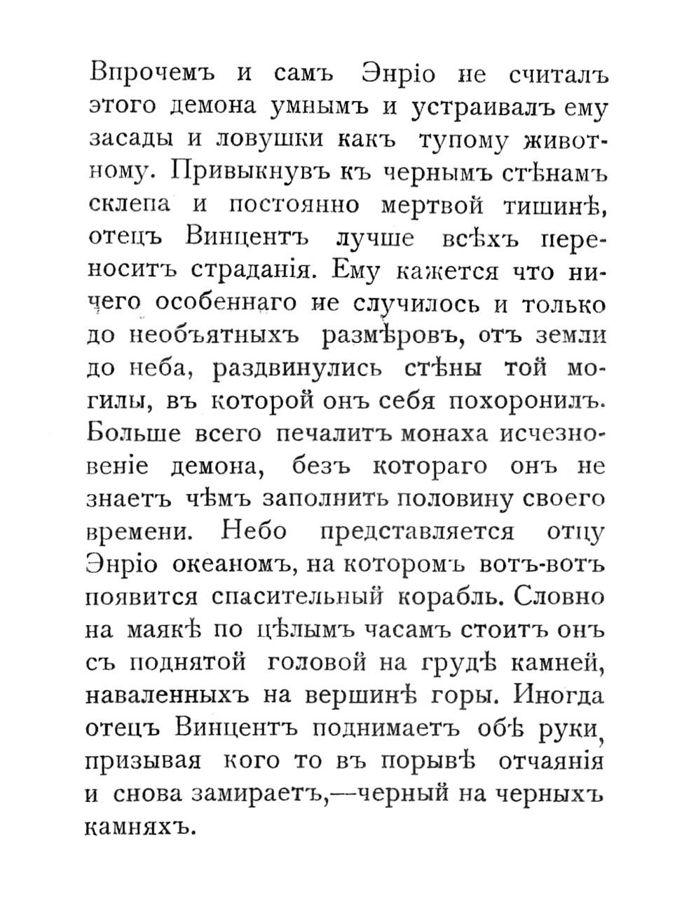 Впрочемъ и самъ Энрю не считалъ этого демона умнымъ и устраивалъ ему засады и ловушки какъ тупому животному. Привыкнувъ къ чернымъ стЪнамъ склепа и постоянно мертвой тишинЪ, отецъ Винцентъ лучше всЪхъ переноситъ страдашя. Ему кажется что ничего особеннаго не случилось и только до необъятныхъ размЪровъ, отъ земли до неба, раздвинулись стбны той могилы, въ которой онъ себя похоронилъ. Больше всего печалитъ монаха исчезновен!1е демона, безъ котораго онъ не знаетъ чЪмъ заполнить половину своего времени. Небо представляется — отпу Энрю океаномъ, на которомъ вотъ-вотъ появится спасительный корабль. Словно на маякЪ по цЪлымъ часамъ стоитъ онъ съ поднятой головой на грудЪ камней, наваленныхъ на вершинЪ горы. Иногда отецъ Винцентъ поднимаетъ об® руки, призывая кого то въ порывЪ отчаяня и снова замираетъ,—-черный на черныхЪ камняхъ.