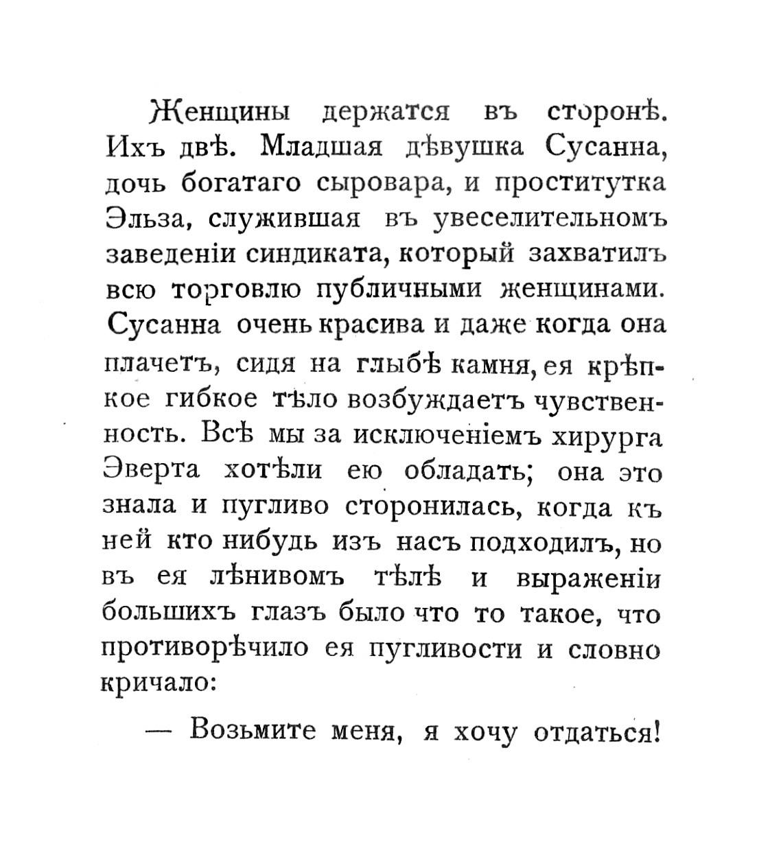 Женщины — держатся въ сторон®. Ихъ двЪ. Младшая дЪвушка Сусанна, дочь богатаго сыровара, и проститутка Эльза, служившая въ увеселительномъ заведен!и синдиката, который захватилъ всю торговлю публичными женщинами. Сусанна очень красива и даже когда она плачетъ, сидя на глыб® камня, ея крфпкое гибкое тЪло возбуждаетъ чувственность. Вс® мы за исключенемъ хирурга Эверта хотЪли ею обладать; она это знала и пугливо сторонилась, когда къ ней кто нибудь изъ насъ подходилъ, но въ ея лФнивомъ тЪлЪ и выражени большихъ глазъ было что то такое, что противорчило ея пугливости и словно кричало: