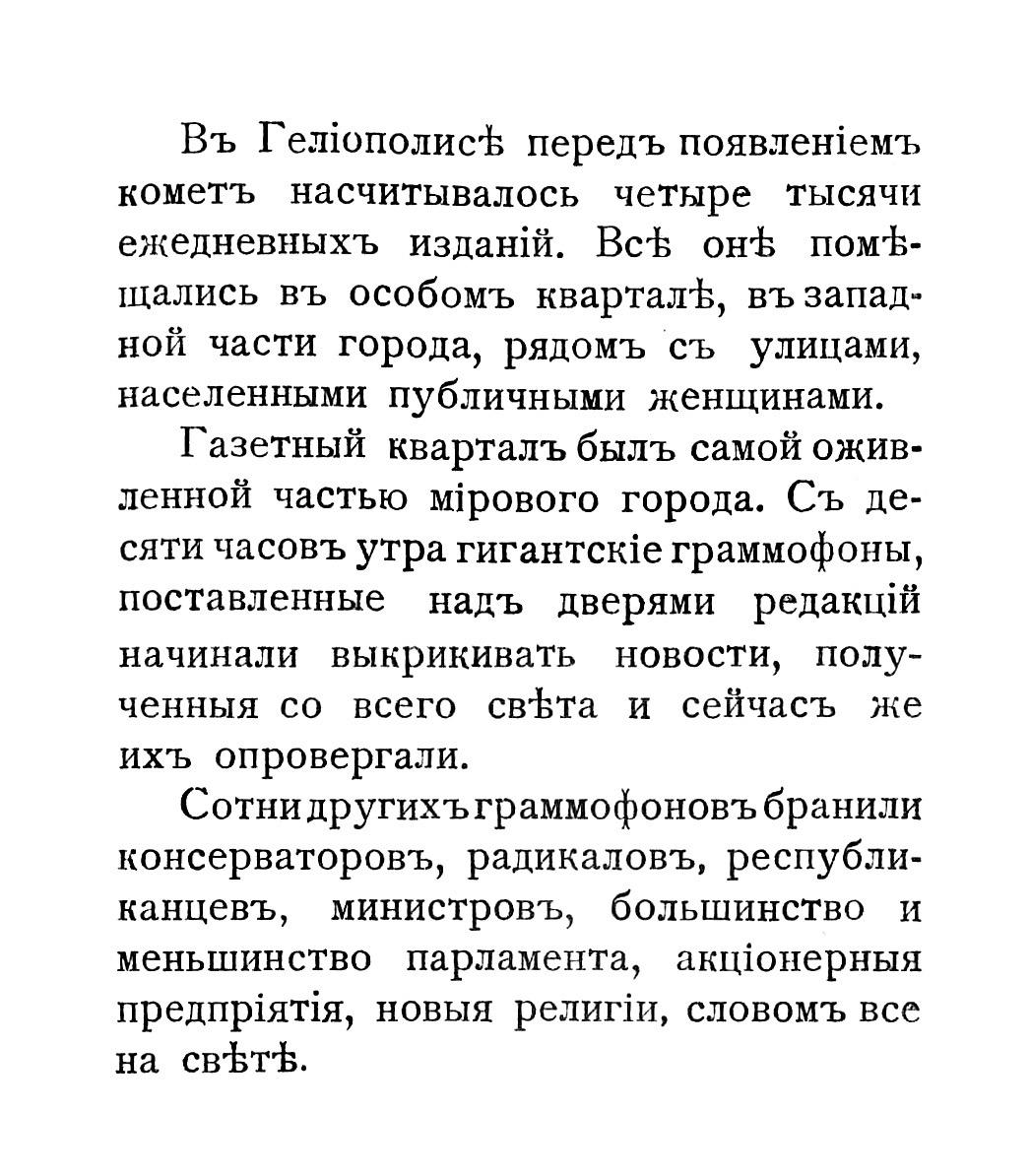 Газетный кварталъ былъ самой оживленной частью м!рового города. Съ десяти часовъ утра гигантск!е граммофоны, поставленные надъ дверями редакщй начинали выкрикивать новости, полученныя со всего свЪта и сейчасъь же ихъ опровергали.