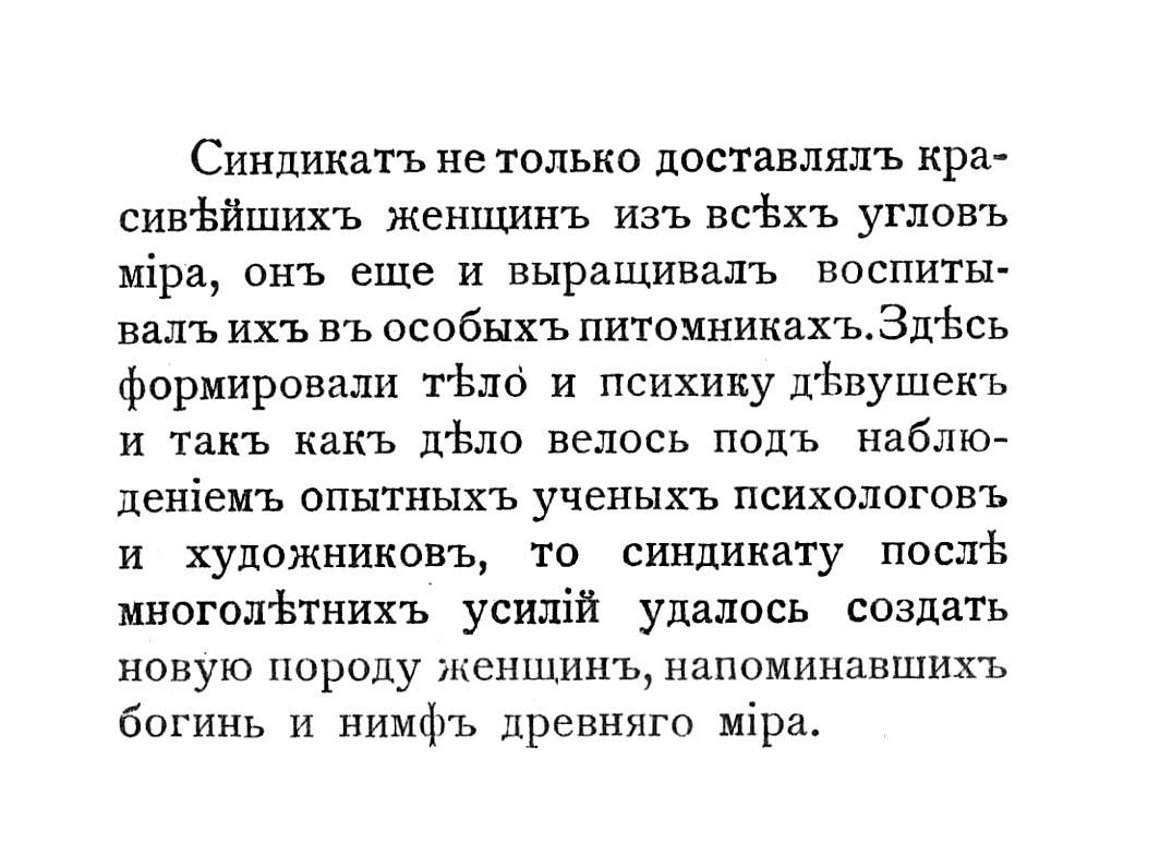 Синдикатъ не только доставлялъ красивЪйшихъ женщинъ изъ всЪхъ угловъ мра, онъ еще и выращивалъ воспитывалъихъ въ особыхъ питомникахъ.ЗдЪсь формировали тЪло и психику дБвушекъ и такъ какъ дЪло велось подъ наблюдешемъ опытныхъ ученыхъ психологовъ и художниковъ, то синдикату послЪ многолЪтнихъ усилй удалось создать новую породу женщинъ, напоминавшихъЪ богинь и нимфъ древняго м1ра.