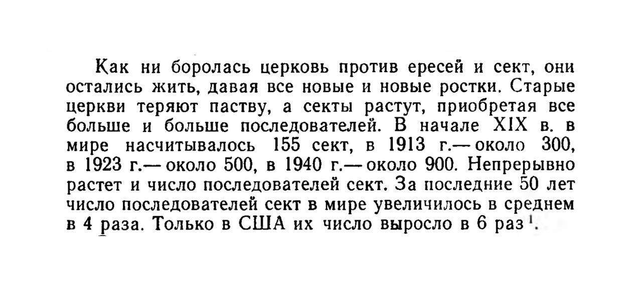 Как ни боролась церковь против ересей и сект, они остались жить, давая все новые и новые ростки. Старые церкви теряют паству, а секты растут, приобретая все больше и больше последователей. В начале Х1Х в. в мире насчитывалось 155 сект, в 1913 г.— около 300, в 1923 г.— около 500, в 1940 г.— около 900. Непрерывно растет и число последователей сект. За последние 50 лет число последователей сект в мире увеличилось в среднем в 4 раза. Только в США их число выросло в 6 раз.