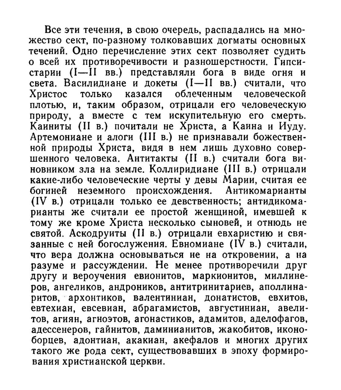 Все эти течения, в свою очередь, распадались на множество сект, по-разному толковавших догматы основных течений. Одно перечисление этих сект позволяет судить о всей их противоречивости и разношерстности. Гипсистарии (1--П вв.) представляли бога в виде огня и света. Василидиане и докеты (1—-11 вв.) считали, что Христос только казался — облеченным — человеческой плотью, и, таким образом, отрицали его человеческую природу, а вместе с тем искупительную его смерть. Каиниты (П в.) почитали не Христа, а Каина и Иуду. Артемониане и алоги (Е в.) не признавали божественной природы Христа, видя в нем лишь духовно совершенного человека. Антитакты (Г в.) считали бога виновником зла на земле. Коллиридиане (111 в.) отрицали какие-либо человеческие черты у девы Марии, считая ее богиней неземного происхождения. Антикомарианты (1У в.) отрицали только ее девственность; антидикомарианты же считали ее простой женщиной, имевшей к тому же кроме Христа несколько сыновей, и отнюдь не святой. Аскодруиты (П в.) отрицали евхаристию и связанные с ней богослужения. Евномиане (ТУ в.) считали, что вера должна основываться не на откровении, а на разуме и рассуждении. Не менее противоречили друг другу и вероучения евионитов, маркионитов, миллинеров, ангеликов, андроников, антитринитариев, аполлинаритов, `архонтиков, валентиниан, донатистов, евхитов, евтехиан, евсевиан, абрагамистов, августиниан, авелитов, агиян, агноэтов, агонастиков, адамитов, аделофагов, адессенеров, гайнитов, даминианитов, жакобитов, иконоборцев, адонтиан, акакиан, акефалов и многих других такого же рода сект, существовавших в эпоху формирования христианской церкви.