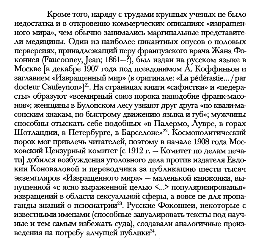Кроме того, наряду с трудами крупных ученых не было недостатка и в откровенно коммерческих описаниях «извращенного мира», чем обычно занимались маргинальные представители медицины. Один из наиболее пикантных опусов о половых перверсиях, принадлежащий перу фра.ъщузского врача Жана Фоконнея (Рацсоппеу, еап; 1861—?), был издан на русском языке в Москве [в декабре 1907 года под псевдонимом А. Коффиньон и заглавием «Извращенный мир» (в оригинале: «Г.а рёйёгавбе... / раг Чос!ецг Сашеупоп»]?!. На страницах книги «сафистки» и «педерасты» образуют «всемирный союз порока наподобие франк-масонов»; женщины в Булонском лесу узнают друг друга «по квази-масонским знакам, по быстрому движению языка и губ»; мужчины способны отыскать себе подобных «в Палермо, Лувре, в горах Шотландии, в Петербурге, в Барселоне»”?. Космополитический порок мог привлечь читателей, поэтому в начале 1908 года Московский Цензурный комитет [с 1912 г. — Комитет по делам печати] добился возбуждения уголовного дела против издателя Евдокии Коноваловой и переводчика за публикацию шести тысяч экземпляров «Извращенного мира» — маленькой книжонки, выпущенной «с ясно выраженной целью <...> популяризированья» извращений в области сексуальной сферы, а вовсе не для пропаганды знаний о психиатрии”. Русские Фоконнеи, некоторые с известными именами (способные завуалировать тексты под научные и тем самым избежать суда), создавали аналогичные произведения на потребу алчущей публики”.