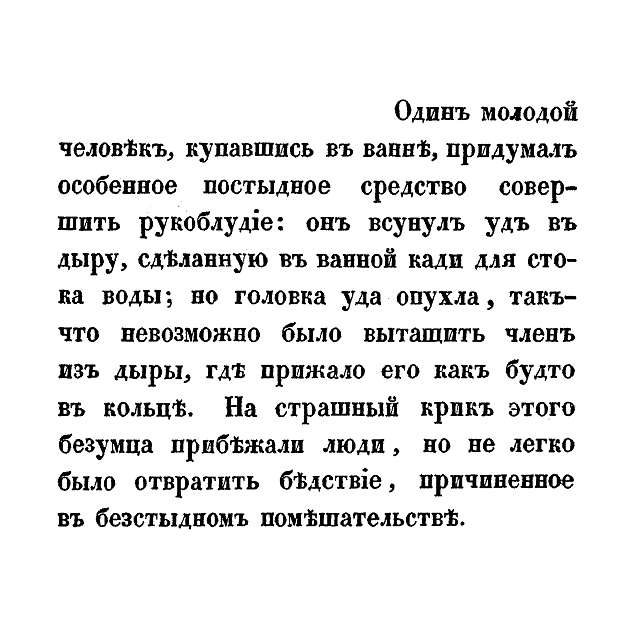 Одинъ молодой человѣкъ, купавшись въ ваннѣ, придумалъ особенное постыдное средство совершить рукоблудіе: онъ всунулъ удъ въ дыру, сдѣланную въ ванной кади для стока воды; но головка уда опухла, такъ- что невозможно было вытащить членъ изъ дыры, гдѣ прижало его какъ будто въ кольцѣ. На страшный крикъ этого безумца прибѣжали люди, но не легко было отвратить бѣдствіе, причиненное въ безстыдномъ помѣшательствѣ.