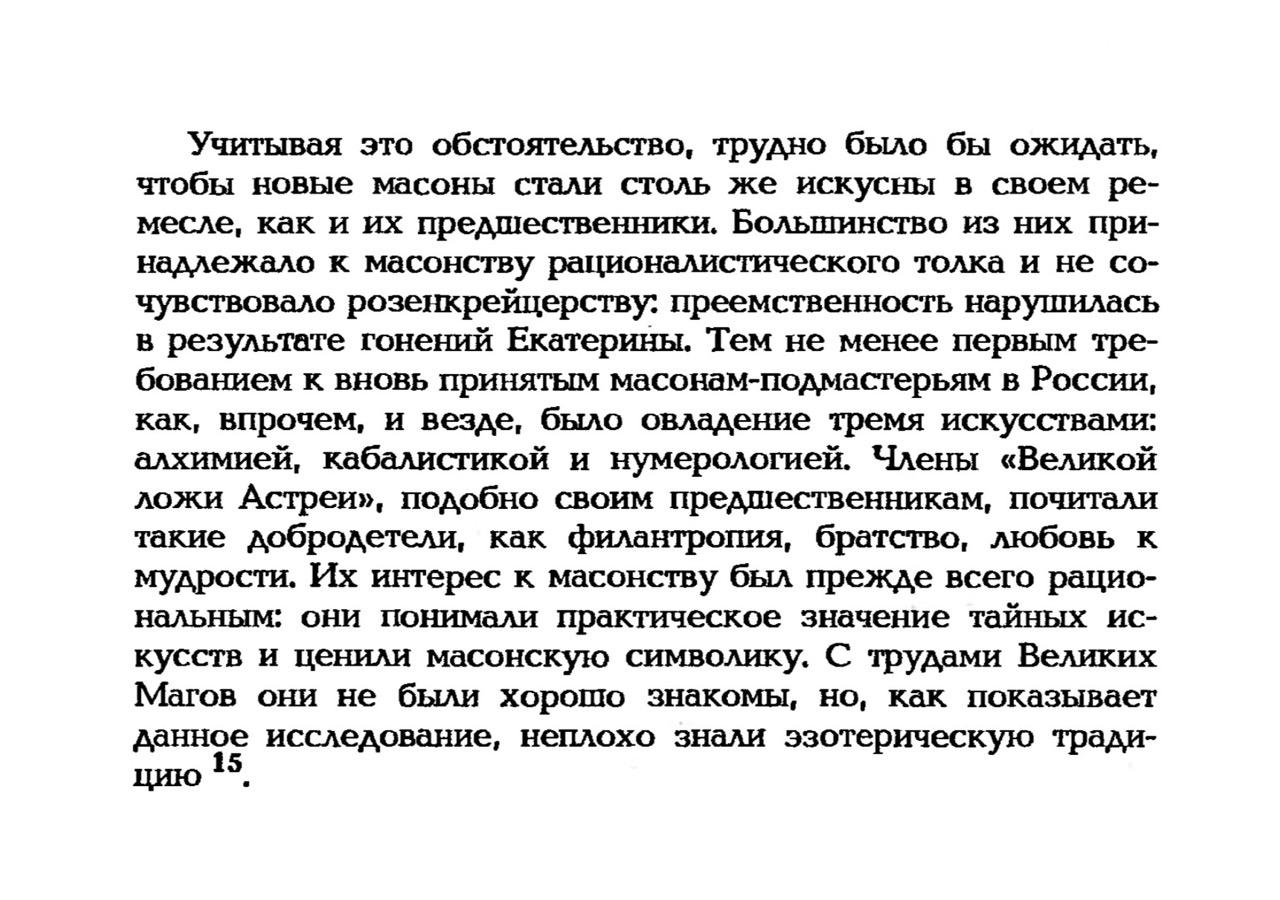 Учитывая это обстоятельство, трудно было бы ожидать, чтобы новые масоны стали столь же искусны в своем ремесле, как и их предшественники. Болшинство из них принадлежало к масонству рационалистического толка и не сочувствовало розенкрейцерству: преемственность нарушилась в результате гонений Екатерины. Тем не менее первым требованием к вновь принятым масонам-подмастерьям в России, как, впрочем, и везде, было овладение тремя искусствами: алхимией, кабалистикой и нумерологией. Члены «Великой ложи Астреи», подобно своим предшественникам, почитали такие добродетели, как филантропия, братство, любовь к мудрости. Их интерес к масонству был прежде всего рациональным: они понимали практическое значение тайных искусств и ценили масонскую символику. С трудами Великих Магов они не были хорошо знакомы, но, как показывает данные исследование, неплохо знали эзотерическую тради цию *.