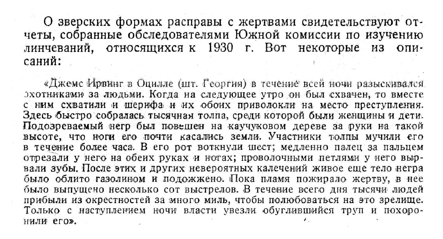 О зверских формах расправы с жертвами свидетельствуют отчеты, собранные обследователями Южной комиссии по изучению линчеваний, относящихся к 1930 г. Вот некоторые из ©описаний:
