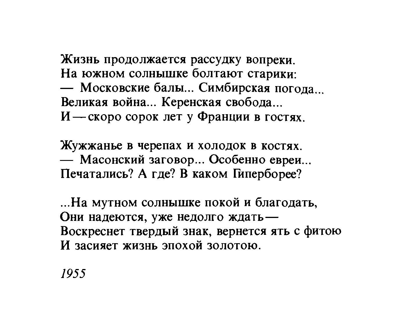 ‚..На мутном солнышке покой и благодать, Они надеются, уже недолго ждать— Воскреснет твердый знак, вернется ять с фитою И засияет жизнь эпохой золотою.