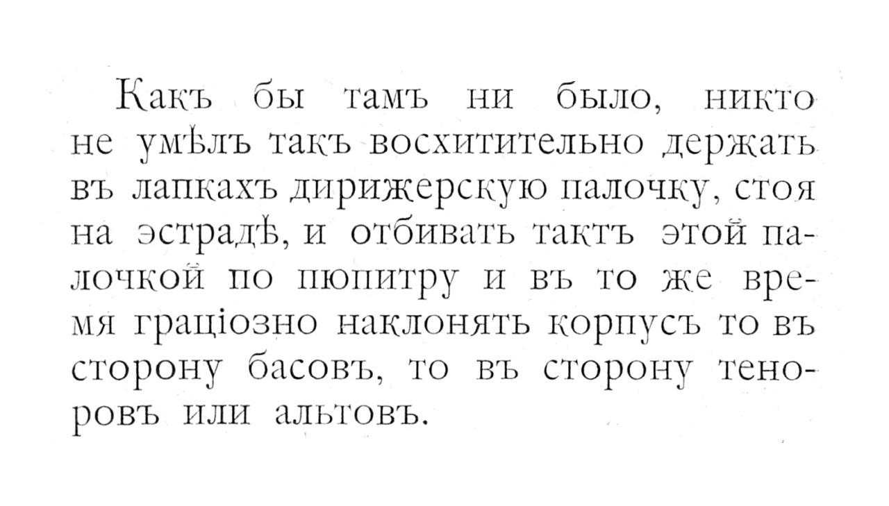 Какъ бы тамъ ни было, никто не умЪлъ такъ восхитительно держать въ лапкахъ дирижерскую палочку, стоя на эстрадЪ, и отбивать тактъ этой палочкой по пюпитру и въ то же время грашозно наклонять корпусъ то въ сторону басовъ, то въ сторону теноровъ или альтовъ.
