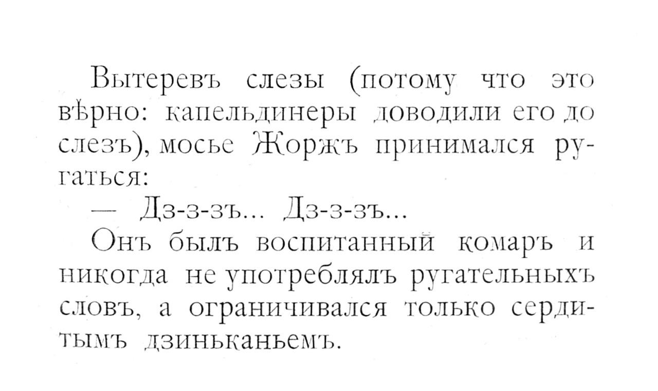 Онъ былъ воспитанный комаръ и никогда не употреблялъ ругательныхЪ словъ, а ограничивался только сердитымъ двиньканьемъ.