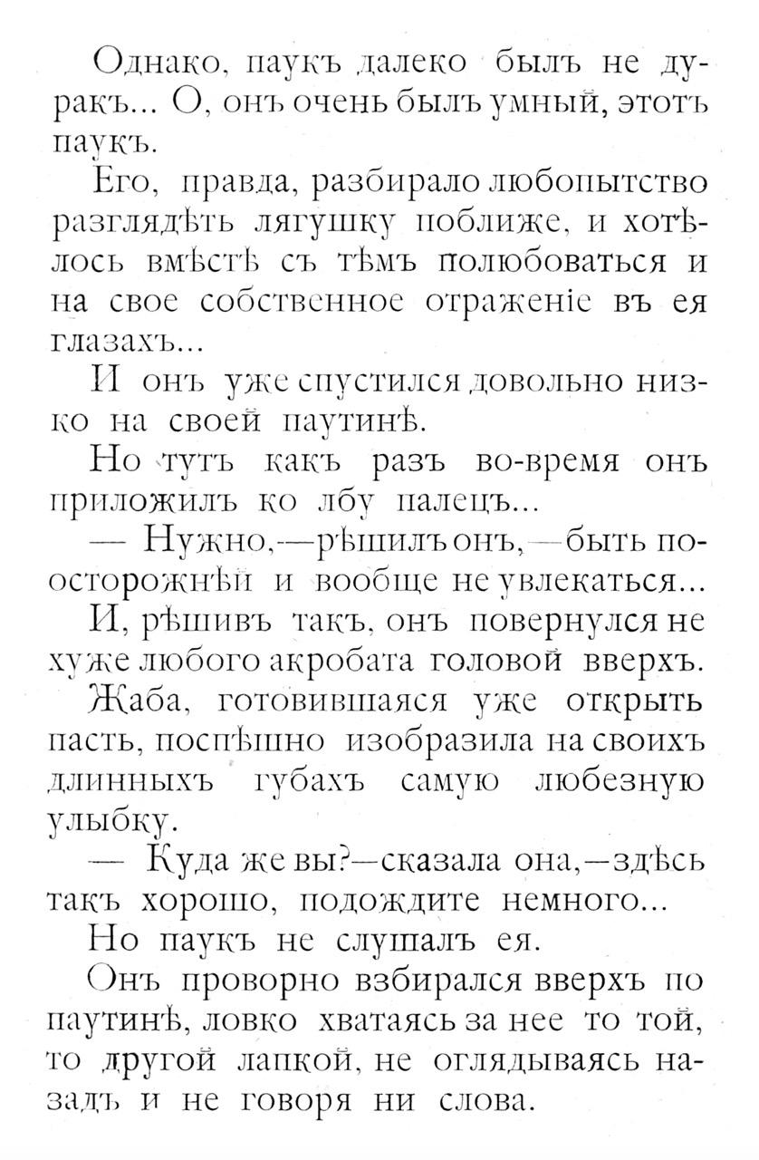 Однако, паукъ далеко былъ не дуракъ... О, онъ очень былъ умный, этотъ паукъ.